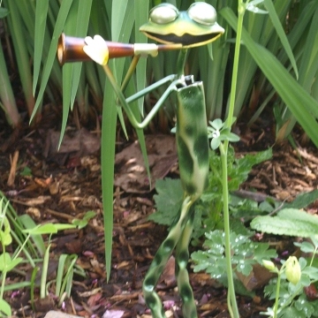 In summer, technicolor frog is mostly hidden by lush foliage in our shade