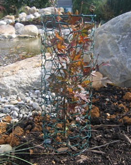 October 29, 2006. Winter is approaching, and with it our resident rabbits' tendency to gnaw down young shrubs and trees to mere nubs. While the attacked plants usually survive, they are set back quite a bit by this merciless treatment, so we try to take protective measures. This year, we have quite a number of newly planted woody specimens, planted along our new pond. So I'm taking advantage of some leftover coated chickenwire from a fencing project to create cage cylinders, which we stake down over plants to protect. The one in the picture is a small-leaved Japanese maple - a slow grower, so any rabbit damage causes quite a setback. Comment on this journal entry |