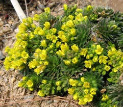 March 20, 2006. We had some warm days earlier in winter, but recently it's been cold and windy. So the early bulbs - crocus and rock iris - are past their peak, but other flowers haven't quite caught up with the arrival of spring yet. This draba here is a nice exception - it blooms very dependably in late winter. Two other cabbage relatives, mountain rockcress and purple rockcress, are also tentatively joining the show. Comment on this journal entry |