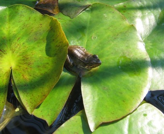 July 01, 2006. There's good news and bad news on the garden critter front - both uncovered during a delightful early-morning stroll through the still-cool garden, wet from days of drenching rain and summer dew. First the good news: froglets! We've had frogs in our pond for many years - but never have we seen evidence of procreation. Then all of a sudden, this morning - four littluns sunning themselves on the lily pads. Somehow the spawn must have escaped our voracious fish this year. Will we have a croak chorus next year?