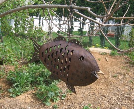 April 19, 2006. Meet Mr Fish! A Christmas present from Amy, we first let him dangle from the Japanese maple near our patio - even though he's not Japanese, it seemed to fit. But when I noticed that the wind was banging the ornament into the tree and badly damaging the bark, I had no choice but to relocate it. It's much less likely to damage the hulking empress tree in our back yard island. All in all, a worthy addition to our garden's animal art ensemble. Comment on this journal entry |