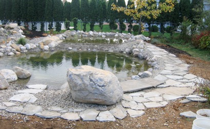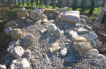 October 21, 2006. Yesterday and today's project: getting a pallet full of flat rock (the local variety is called "Colonial stone") and using it to make a walkway around part of the new pond. The pondbuilders had left us with a bed of pebbles all around the pond, to hide the edges of the liner. But we didn't think the pebble beach look fit very well into the rest of our garden scheme, and preferred a different material to define the border between the pond proper and the areas beyond (which will be mostly lawn, at least for now). We used the same variety of rock in our side garden and in the lane, so it was a natural choice for the job. Comment on this journal entry |