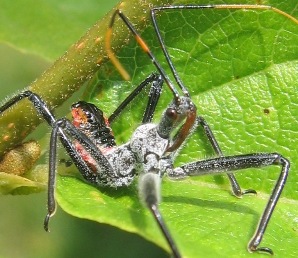 June 13, 2007. It's June - the garden's bug diversity is improving! Best bug of the year so far: this immature wheel bug (Arilus cristatus), the largest of the assassin bug family. Found hiding in between a couple of leaves on our small parrot tree, waiting for a juicy bug to sink its ferocious mouthpiece into.