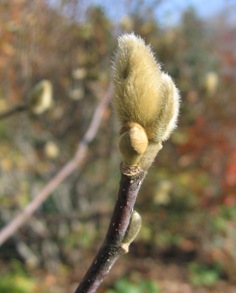 November 25, 2007. Wonderful weather today - temperatures in the 40s, sunny, not too windy. Last of the leaves tumbling out of the trees... I spent the morning putting cages around young woodies needing bunny protection, and snapped a few photos. Couldn't resist this image of a fuzzy star magnolia bud, just biding its time till April. Comment on this journal entry |