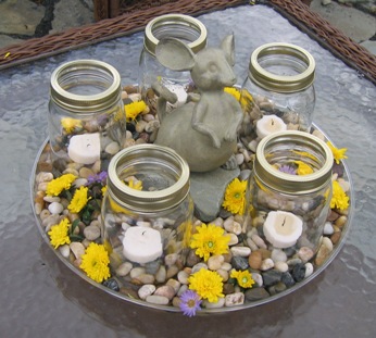 September 15, 2007. Another day of tidying up in anticipation of tomorrow's tour. Amy has come into action the past few days as well, providing gentle directions (those dead-looking stalks don't look so good, dear) and helping with deadheading and general cleanup around the patio. Today she kicked it up a notch, preparing a few decorative features to dress up our garden tables. They included a delightful flower arrangement set inside a baby pumpkin we grew this year. But the real conversation piece, I expect, will be this mixed-media work. When I commented it looked like a shrine to a mouse (it reminds me of little religious displays I remember seeing in tucked-away temples in Hong Kong) Amy was none too pleased - but we both agreed it was one of a kind. As is our garden! Comment on this journal entry |