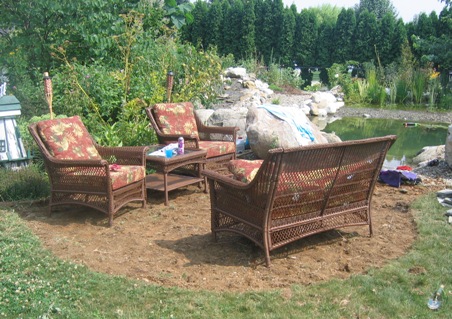 July 29, 2007. Ever since the big pond was installed, the subsequent addition of a pond-side patio was inevitable. And following the purchase of patio furniture a few weeks ago, the countdown clock really started ticking. So when this morning it rained for hours on end, it seemed like a good time to strip some supple sod to define the outline of our new outdoor living area. After Amy implored several times "bigger, honey!", we finally settled on the size and shape shown here (with furniture hauled in just to see how it would fit). Lots more work awaits, but at least there's a vision... Comment on this journal entry |