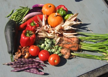 September 30, 2007. A week into fall, and no real rain for a few weeks. The garden is starting to take on that home-stretch look, but fall cleanup is still a ways away - at least until after we get the first freeze. In the meantime, I decided to do some cleanup in the veggie garden, which is always a tangled mess by this time of year. I gathered up a sampling of the garden's offerings in the process - some (zucchini, pumpkin, beans, eggplants, popcorn, shallots) are the last of the fading crop; others (carrots, brussels sprouts) are just arriving; and the tomatoes and peppers are continuing their bountiful production as they have for some time now. In all, not exactly a family-feeding level, but it looks pretty anyway. Comment on this journal entry |