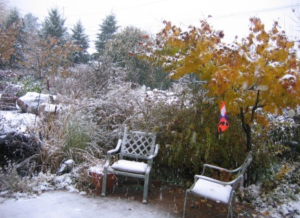 November 18, 2007. Last winter, we had to wait till well into the new year before we saw any snow. So we were pleasantly surprised to wake up this morning to big fluffy flakes gently making their way downward. The temperature has hovered just above freezing all day, so the snow isn't exactly accumulating, but sticking around long enough to color the landscape white. We don't often get the combination of fall color and snow, but the Japanese maple shows up nicely in this scene, don't you think? Comment on this journal entry |