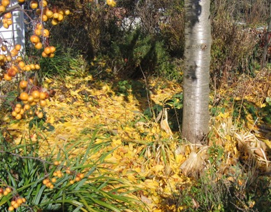 November 23, 2007. Since that snowfall last weekend (which managed to accumulate enough for snowman production!), the weather has been all over the place - rainy and cold, rainy and mild, sunny and warm (short sleeves warm!), and finally, chilly and windy. In the process of all that, the large weeping cherry in the side garden managed to drop nearly all its leaves, making the most amazing yellow carpet underfoot. This photo doesn't really do it justice...