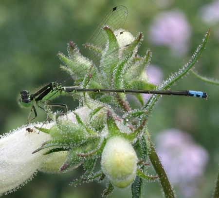 June 10, 2009. Our damselfly population has exploded! Everywhere in the garden I look, I they are hovering and dancing, in their graceful ways. I credit our large pond with associated bog filter, which has given their larvae a place to hatch (my boys have found several newly-emerged, wet-winged damsels in recent weeks, to their great delight). This morning, as I was taking photos around the rock garden, one alighted on a penstemon bud, still laden with dew. I didn't notice until later that it had brought along some prey - damselflies feast on small flying insects. Go get them no-see-ums, ladies! Comment on this journal entry |