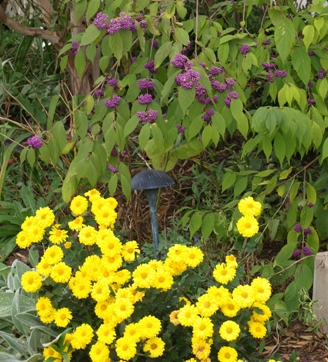 October 26, 2009. Oh, it's a typical autumn allright - veering between days of being pelted by windswept cold rain, and glorious mild sunny days with that particular quality of light... We had one of each this past weekend: after Saturday's winds blew most of the rest of the leaves off of many trees, Sunday was a delight. I don't spend enough time in the garden this season - it's about to dusk when I get home from work, and weekends seem to fill themselves with other activities - but when I do, I enjoy just strolling around, not doing much of anything in particular, and taking in the sights. Still, I was surprised by this one, the screaming colors of the hardy mum and the Japanese beautyberry competing for attention in a vivid vignette. Better enjoy it now, soon the only gardening left to do will be indoors. Comment on this journal entry |