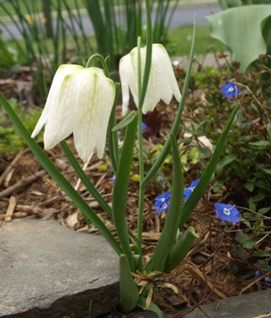 April 19, 2009. Wonderful weekend, sunny and warm! After a full Saturday getting trained on the ins and outs of Cub Scout outdoor activities, I put Sunday to good use getting the orchard nursery area organized to accept the hundreds of new seedlings that will soon be itching for a spot in the outdoors. A few of the hardier varieties already got planted there. Today also marked the first mowing of the lawn this year. And in between all of that, I found some time to walk around the garden with my camera and take snapshots of what's emerging and what's already in bloom. One of the photos was of this fritillaria, proudly flowering in our front lane garden. But what I didn't recognize till I looked at this photo was that it was surrounded by little bright-blue flowers. Wildflowers ("weeds"), of course - but still eyepopping when you look at them up close. Comment on this journal entry |