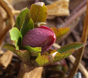 Meanwhile, only a few plants are exerting themselves in the garden. It's the usual suspects: snowdrops, rock irises, crocus, and of course hellebores. Some hellebores have fully open flowers, but I was particularly taken by this beautiful bud with its fresh green accompaniment.