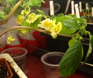 March 30, 2009. I must be getting better at timing my seed-starting activities. Most years, I have at least one variety that decides it's time to bloom under the lights when we're still in early February. Charming, but not particularly helpful, when they still have weeks to go before making their way outside. In following years, I make sure to start the species in question a few weeks later. This year, my first inside blooms didn't arrive until late March. They came courtesy of Impatiens scabrida, which I'm growing for the first time this year. The creamy yellow flowers are cheerful, but the plants are clearly not too happy about living inside - their stems are already stocky, and they're a bit squashed between the many seedlings nearby that don't grow quite so fast. Needless to say, I'll shift the seed start date backwards for these, too.
