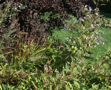 September 13, 2009. Late summer into fall is the messiest season in the garden. From the stark landscape of winter come the prim new beginnings of early spring, where each plant can be admired individually. The exuberance of late spring and early summer follows, and everything in the garden seems just right, colorful and bountiful but still in proportion. Then come the dog days of summer, and the Japanese beetles, and flowers turn to seedpods – and the garden takes on a messy-mop look. But it's not necessarily a bad hair day – I think of it as a funky 'do. In the scene here, sprays of blue wildflower asters on floppy stems provide some color among the developing panicles of sea oats, the seedheads of beetle-bitten swamp mallow, reddish-brown stalks where Siberian irises shone months ago – all offset by 'Diabolo' ninebark, now featuring its darkest coloration. For each season a different feeling, that's what a garden is all about. Comment on this journal entry |