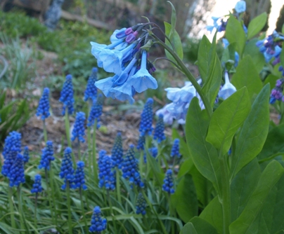 April 24, 2009. The first of several warm days (it's supposed to get real hot over the weekend), so I took the afternoon off to wage war on the list of garden tasks that need doing. I'm slowing down in the area of potting up plants for the sale - nearly there now. But many hundreds of seedlings are waiting to be planted, the vegetable garden needs to be started for the year, and the cutting garden needed a good spring cleanup. I almost forgot to walk around and look at what's blooming! But of course I did, and I was particularly enamored of this combination of Virginia bluebells and grape hyacinths. As usual, I claim no credit (nor blame) for this arrangement - in our garden, plant combinations just kind of happen. Comment on this journal entry |