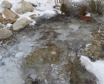 January 17, 2009. My first journal entry of the new year, to honor the cold snap we're experiencing - the temperature was -2°F when I woke up this morning, colder than I remember seeing in recent years. So we'll see how well marginally hardy plants fare this winter. Meanwhile, the big pond is going through interesting ice patterns. We leave the circulation from the main pond through the filtration bog going year-round; ordinarily the flow comes across a pebbly ford, but the entire surface of the ford is now covered in ice, with water and air bubbles performing shadow puppetry underneath. I took this picture standing on the middle of the main pond - the ice cover felt nice and solid! Comment on this journal entry |