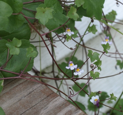 | June 07, 2010. Plants come and go in any garden - and I suspect the turnover in ours is quite a bit larger than in most. A good part of the fun of gardening to me is experimenting with growing new things, many of which turn out to be not hardy, misplaced, or just unhappy. Every year there are many occasions when I suddenly realize that this or that plant just failed to return - in many cases despite seeming happy the previous season. So it was, I thought with this Kenilworth ivy, which had the misfortune to be planted in a corner off our patio behind the gas grill, where it had to contend with many much taller neighbors. I had noticed it was struggling last year, and didn't notice its return at all this year - until I stepped out onto our patio today, and there it was - right by my feet. It had traveled about six feet along the foundation of the house to find a spot where it got a bit more light, and was presenting its happy-faced flowers and dainty little leaves to the incoming sun rays. Brought a happy smile to my face, too! Visitor comments