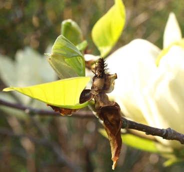 | April 11, 2010. Ack! What a week! Following on the heels of plenty of unseasonably warm weather in March and early April, we had three days of temperatures in the high 80s this past week. Which meant that all the flowerbuds that were patiently waiting to show off their color went into overdrive, and bloomed themselves out in one fell swoop. The dogwood that normally blooms in May did its thing a full month early. And Magnolia 'Elizabeth', pictured at right, already looked tired a day after it started blooming. Amy made fun of me this week, as I was cursing Ma Nature for making the height of early spring (the season to which I look forward most) last a mere three days. But I guess I'm over my frustration by now, as a milder (but still warm) weekend got me focused on many other things. I'm aching now, mostly from taking down the massive yew that had dressed up the front of our house for the past dozen years (it had started to obscure a front window and just got too big for its space), and moving the smaller (but still sizeable) Chamaecyparis pisifera 'Snow' from a different part of the garden to take the yew's place. When I first got 'Snow', I was under the mistaken impression that it was a dwarf conifer. When it grew taller than me in the past couple of years, I knew I would have to move it from the middle of the perennial border where I had planted it - but had procrastinated on doing so until now. My bed will feel mighty good tonight. Visitor comments