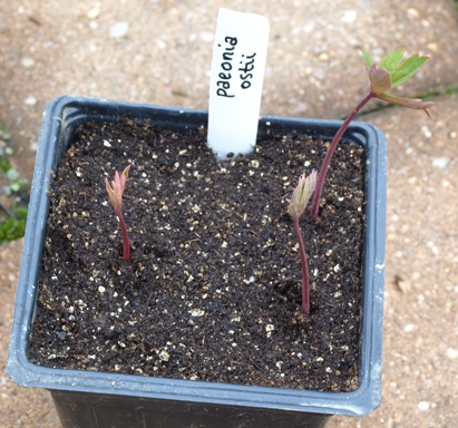 | March 15, 2010. Hey, here are some more seedlings to make baby sounds at out of sheer excitement over their new-born cuteness. I had tried several times before to grow tree peonies of various species from traded seed, but never had any luck. This time it appears I have succeeded, due in no small part to excellent instructions from my trading partner. She detailed how the seeds first sprout a single root at room temperature, after which they need to be subjected to cold conditions for a while to develop a more extensive root system. All of that took place in baggies, with a bit of damp potting soil stuffed alongside the seeds. When I took them out of the fridge (sure enough, more roots!), I put them straight into pots, and sure enough, seedlings pushed up a few days later. The whispy leaves atop burgundy stems open up further after a day or two. I'm hoping I can give these the right conditions to grow on to maturity (I failed already once with P. obovata, which perished shortly after I set them into the nursery area). Wish me luck! Visitor comments