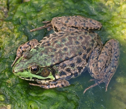 June 27, 2010. One of the best parts of the swimming pond is all the wildlife; this year, the bullfrogs have become bolder, and don't seem to mind spending their time right alongside humans of various ages — even the ones who delight in catching them, running around with them for a while, and then releasing them back into the pond. While swimming yesterday, Lily spotted (no pun intended) a particularly speckly one, just lazily sunning herself on the ford area where our filtration bog overflows back into the main pond. Not at all concerned with the attention, she allowed me to take her picture from as close up as I wished. The size of her tympanic organ, about the same size as her eye, identifies her as a girlfrog (boys have bigger ones). She must fancy herself queen of the pond, with her flashy get-up. Comment on this journal entry |