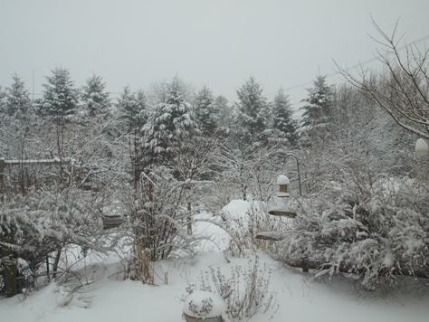 | February 10, 2010. It snowed a bit today. This view from the back door across the patio and the little pond (can you find it?) was taken in the morning, before the bulk of the snow arrived. It's good to have a real heavy snowfall again, after quite a few years of relatively light snow years. Between what was left from the snow we got over the weekend and what came down today, there's a good 19 inches on the ground. I hope it sticks around for a while, even if the shoveling today didn't do my elbow's tendonitis much good. Visitor comments