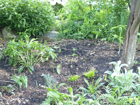 April 18, 2010. Another busy weekend. Breezy and cool, following a thunderstorm on Friday - good spring gardening weather. Potting up plants for the sale was in high gear, but will be slowing down from here on out: it's time to start getting this year's seedlings into the ground! Meanwhile, I spent some time getting an area of the side garden that was getting overrun by several bullies into a fresh and clean state. The offenders included the imposter adenophora (most likely Campanula rapunculoides), which I've not been able to banish from the garden despite years of concerted effort); coltsfoot, a weed which I was foolish enough to allow to develop out of curiosity, before realizing it belongs to the conquer-the-world-by-roots clan; and sea oats, which I appreciate in their proper place, but have the unfortunate tendency to seed around indiscriminately.