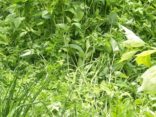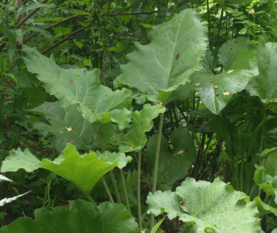 June 14, 2014. Forgotten corners of the yard can be wild and woolly places. Our garden has several of them: areas where tall weeds and semi-weeds run rampant, sufficiently out of sight that they escape the eye of the gardener, who prefers to devote his efforts to more visible parts of the landscape. One of them is the back side of the hill behind our big pond. The waterfall, if the pump feeding it were actually running, comes down from the top of that hill along the front side, but the back side is a very different place. At one point, I referred to the area as "the tall zone", where I allowed taller-growing plants to duke it out. Several of those plants still grow there, including motherwort, cup plant, oriental goat's rue, and wingstem. I think of them as semi-weeds: I put them there on purpose, but they are too vigorous for a traditional garden setting, so now they are at best tolerated. This week, while yanking out some of those weeds and semi-weeds by the armful, I came upon these magnificent specimens of burdock. A weed for sure, but you gotta admire a plant that makes giant leaves like that. I decided to let them grow, at least up to the point where they want to set seed. Comment on this journal entry |