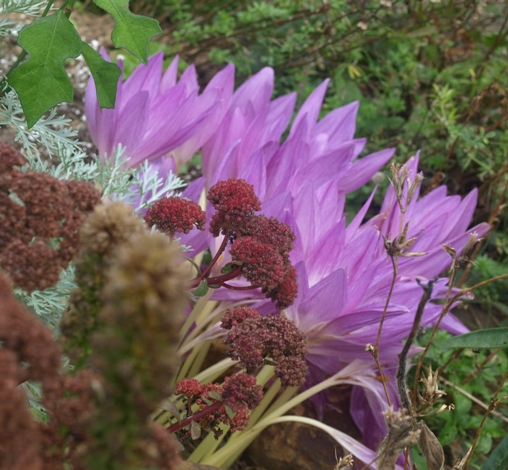 September 29, 2014. OK, I couldn't resist putting another picture with Sedum 'Red Cauli' up here, although by this time, the Colchicum 'Giant' is decidedly the show stealer. We're into autumn now, which means I can legitimately enjoy the burnished colors and somewhat tattered state of things around the garden. The summer poinsettia whose leaf is at top left in the photo is still going strong though. I don't have much time to enjoy the scenery, with soccer coaching duties taking up most of the daylight hours outside of my day job – so it's good that this little scene unfolds right along the front walkway, impossible to ignore. Comment on this journal entry |