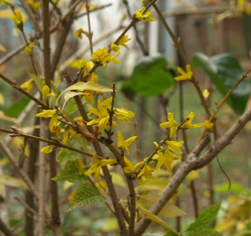 November 16, 2014. I ventured out into the garden one afternoon this past week, armed with my camera to catch some of the seasonal color: the firy leaves of the Kwanzan cherry, Virginia sweetspire, red chokeberry, and any others I could spot. I expected to find yellows, oranges, purples, and reds all around me – and I did. But one sighting took me by surprise: the profusion of yellow flowers on our 'Kumson' forsythia. We mainly grow this one for its variegated leaves, although it does provide the same yellow flowers as common forsythia in early spring. To tell the truth, ours is tucked into a mostly shady, out-of-the-way corner of the garden, so it doesn't get much attention. Maybe that's why it decided to go all out on this late-fall day and strut its floral stuff. It's not even like we had very odd weather – sure, we had a few mild days following a few colder ones, but nothing out of the ordinary for a Pennsylvania autumn; not like a stretch of seventy-degree weather in January, like we had a few years ago, which really messed up the garden's sense of time. And it's not like a couple of flower buds got confused and opened prematurely, as sometimes happens on our nectarine tree on a warm day in winter – no, 'Kumson' went all out, producing a full bloom, which probably means it won't repeat the act come spring. And that's OK – I'd rather be surprised once in a while than be treated to the same predictable displays year after year. Comment on this journal entry |