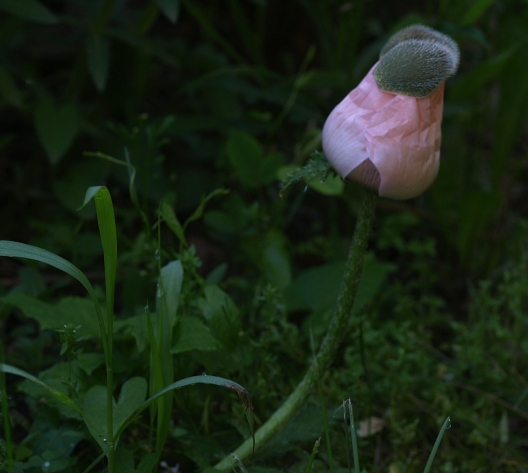 | May 31, 2014. An entry in the double-take series – while walking around the garden early this morning, before the sun's rays reached the area I was approaching, I spotted what seemed like an otherworldly apparition, some hideous pink thing emerging right from the soil. Closer inspection set me straight: it was merely an oriental poppy about to burst out of its bud, its stem for some reason trailing along at ground level instead of held upright as I'm used to seeing them. Good for a chuckle, and a quick photo. Visitor comments