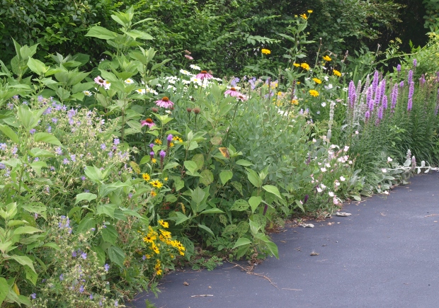 July 06, 2014. Our driveway bed is a long narrow strip of plants that can tolerate heavy snow loads in winter and scorching reflected heat in summer (without much supplemental watering). Of the scores of species I've attempted to establish, only the toughest ones have survived – but they make quite a show of themselves in summer. In this picture, the liatris have just started to bloom with their purple spikes, Shasta daisies sidle up against purple coneflowers and perennial sunflower, some meadow cranesbill is nearing the end of its bloom, and evening primrose peeks out with its pink cup flowers in various places. Baptisia is done, but the hardy hibiscus is still some weeks away from displaying its in-your-face flowers. It's not the tidiest part of our garden (I say euphemistically – our garden really doesn't have any tidy areas), but I enjoy it quite a bit. Comment on this journal entry |