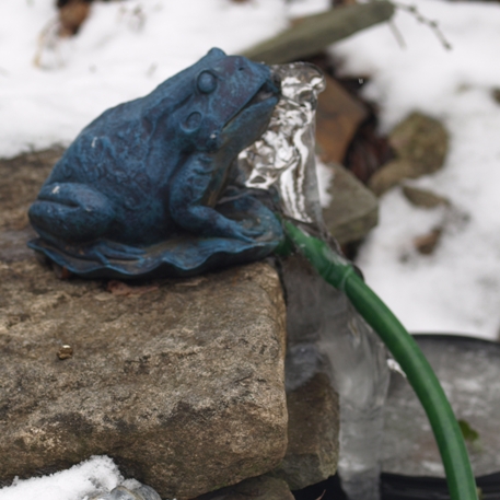 January 19, 2014. Spitterfrog enlivens our little patio pond year round: the water he squirts from his mouth (with a little help from an electric pump) fills the air in our back yard with a constant splashing sound. In the summer, the forceful jet sometimes peters out to a dribble, due to algae or pond muck stopping up the pump filter – but in the colder months, the filter stays clean, probably because algae don't grow and fish aren't active to stir up the muck. So spitterfrog just keeps on going – until it gets really cold. This morning was one of those times when things just got too nippy... Comment on this journal entry |