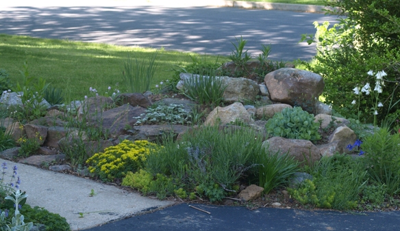 a view of the completed rock garden not shown on the project page | April 12, 2014. The past two weekends have (finally!) featured lovely weather, drawing me into the garden after a long, cold, wet and snowy winter. Just in time to execute a project I've had on my to-do list for a while now: my periodic overhaul of the rock garden. I describe the project in more detail on a separate page, and hope to be back with updates on how the new arrangement is working out in future posts to this journal. For now, it just feels good to be back in the swing of a new season of gardening. One that will feel cramped, with kids soccer, my cycling hobby, family vacations, and other obligations all competing for those few hours of spare time. So I'm glad that at least it got off to a pretty good start.