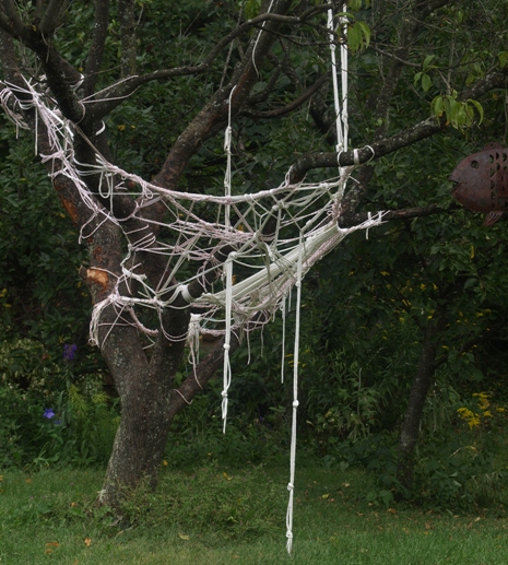 September 14, 2014. It all started with Boy Scout summer camp – apparently some company had unloaded lots of no longer wanted rope for scouts to take home. So Max and Ben stuffed their foot lockers with as much as they could lay their hands on. Once home, on one of those lazy summer days when boredom set in, all those lengths of rope needed a purpose – and what better to do with it than to build a great mess of tangles in our poor nectarine tree? The lower trunk and major branches of the tree have been devoid of leaves for some years now, which provides an excellent framework for ropistry. Supposedly there are chairs and hammocks that provide marvellous comfort and utility, but somehow, the boys never returned to their creation once it was made. So now, weeks later, it's still up there, no doubt upsetting our poor ironfish, who is constantly air-swimming in the direction of a giant net. Hopefully we can convince Max and/or Ben to undertake the task of undoing the knots and untangling the structure – which will most likely take longer than putting it together in the first place! Comment on this journal entry |