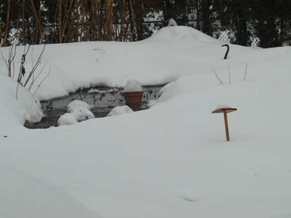 | February 13, 2014. Snow day! We've had more than our usual share of flakes since earlier this winter, but this week really clinched it, with a good foot of now falling on top of almost a foot that hadn't yet melted from the last storm. It was hard to find a surface not covered in white fluff when I strolled outside during a lull in the storm. But the pump in the big pond keeps on going, and the spots where the water has some velocity are those where the snow doesn't persist. The pond proper is covered with ice and snow, but the bog filter from which the water overflows is partially clear. See Mr Crane just peeking out over the snowline? Visitor comments
