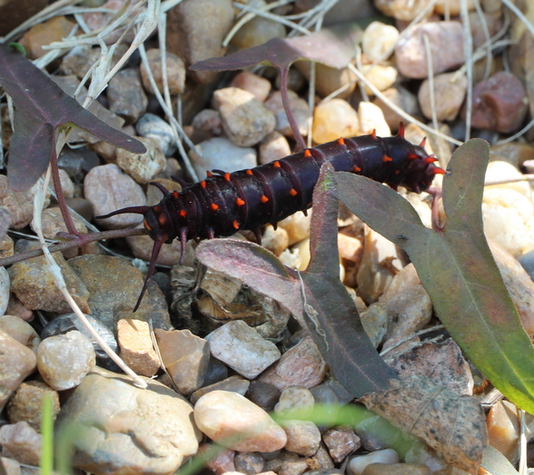 One of the reasons I plant pipevines (Aristolochia species) in the garden is to provide habitat for pipevine swallowtail (Battus philenor) butterflies, whose caterpillars are pipevine-picky eaters. Back in Pennsylvania, the one species I grew was Dutchman's pipe (A. tomentosa), a huge woody vining monster that climbed high into a neighboring weeping cherry tree. It may very well have attracted swallowtails (there was so very much of it, with many places to hide), but I never spotted their butterflies. Out here in Texas, my selections of pipevine have been decidedly more demure, thus far limited to white-veined pipevine (A. fimbriata) and Watson's pipevine (A. watsonii). Both are ground-sprawlers more than climbers, and not nearly as vigorous as the old Dutchman's pipe. At least the white-veined one has fairly substantial leaves, while Watson's leaves are narrow and unsubstantial (although the maroon arrowheads have an undeniable elegance). I always doubted that any one plant was sufficient to sustain a voracious caterpillar, but kept the plants out of curiosity. After recently completing the new rock garden zone, I transplanted one of each plant to the front of this new area, which I've been patrolling carefully to nip any weed infestations in the bud. I'm happy to report that on those patrols in recent weeks, I spotted a pipevine caterpillar on each of the plants – a few weeks ago on A. fimbriata, and today on A. watsonii. As you can see in the photo, there really doesn't seem very much for the poor thing to munch on, yet the caterpillar has reached what looks to be a viable size. I still haven't seen adults in my garden, but hopefully the youngsters, should they develop their wings, will spread the word about this little garden in suburbia. I'll be happy to plant more pipevines, now that I'm convinced: if you plant it, they will come! Comment on this journal entry |