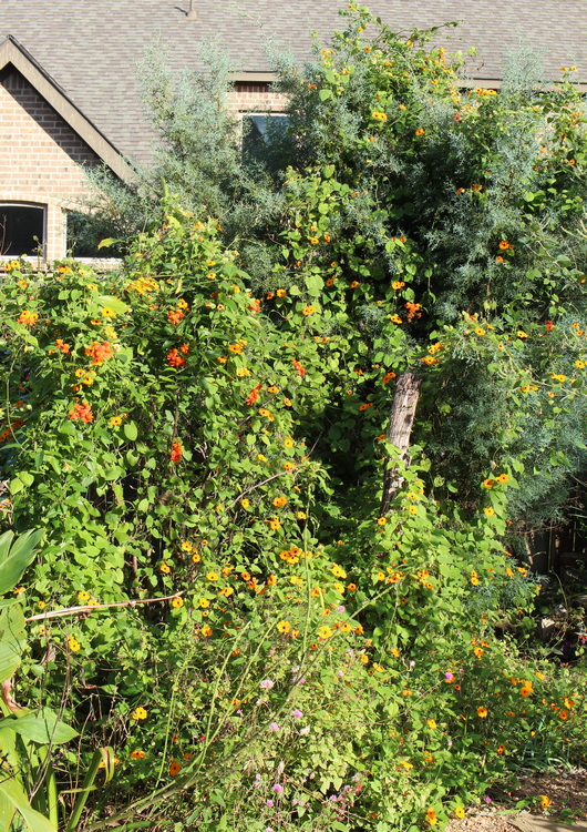 Sometime this spring, I walked out of a nursery with a small specimen of black-eyed Susan vine (Thunbergia alata), thinking it would be a nice way to cover the four-foot-high stump of the silver-dollar tree that had been killed by the freeze a few months earlier. Well, the vine didn't show much inclination to cover said stump – it cheerfully bloomed, but despite my coaxing and attempting to manually wind the vines around, they would just slump down and look elsewhere for support. Eventually I gave up, just watching every once in a while how Susan was conquering adjacent territory, removing her vines where they got in the way or endangered neighboring plants. Then, in the fall, I didn't get out to the backyard as much any more (or maybe I just blinked), and left my vine to her own devices. Yesterday, Christmas break having arrived, I strolled around the garden, and was struck by the vast expanse covered in an orange-yellow-tinged haze by the black-eyed damsel (aided, in a more limited fashion by her beau, the Mexican flame vine): the poor little magnolia right next to the pond is completely overtaken, while the Arizona cypress behind will soon face the same fate, if killing freezes don't arrive soon. As for that stump: you can see it in the middle of the picture, the upper half still uncovered. I'll have to come up with more effective management strategies next year, if Susan's roots survives those freezes. Comment on this journal entry |