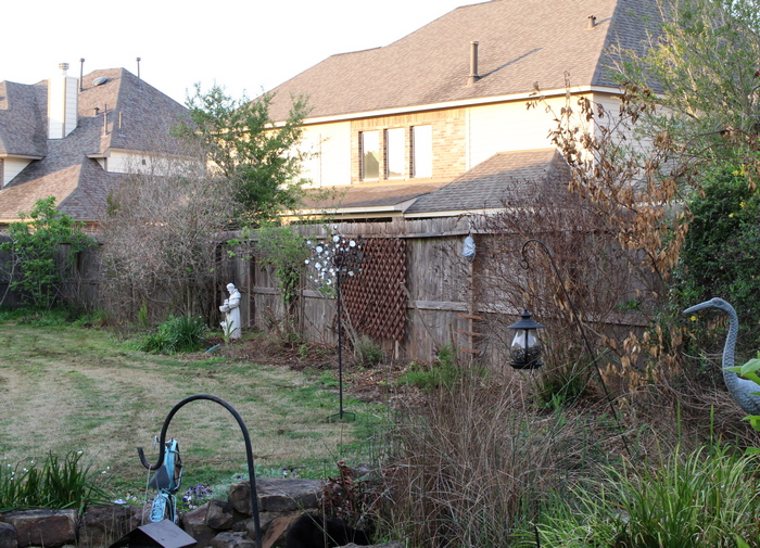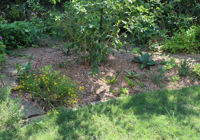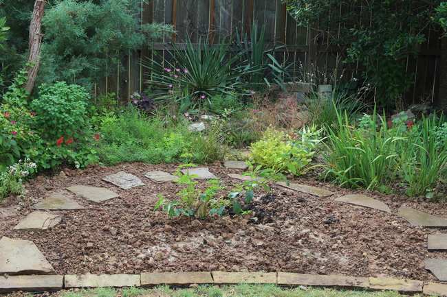 Out of the mud, a new extension of our back yard garden borders was created. The photo here shows it just before plants were added to the new area; the almond verbena was previously surrounded by lawn, and is now in the center of the area I'm calling the rock garden zone. The existing rock garden, dominated by two large yuccas, is immediately behind, and I intend to make this area a visual extension of that, populated mostly with lower-growing drought-tolerant plants such as agaves, aloes and manfredas, rain lilies, and snake herb. Many of those were already growing in the area just in front of the rock garden, so I hope to weave all those into a cohesive section of the garden, bordered by an Arizona cypress, a small magnolia, and the pond to the left, our large live oak in the back right corner, and a few larger shrubs and the rapidly returning lemon eucalyptus to the right. To satisfy the new plants' needs, I incorporated a decent amount of sand into the soil, and made sure it was all mounded well above the level of the surrounding lawn. If I'm successful, this will also be the first part of our Texas garden that we can walk through, rather than just alongside, using the semicircular flagstone path. But my projects have a habit of developing in different direction than I first envision, so only time will tell how it turns out. Stay tuned for updates in future gardening seasons!Visitor comments